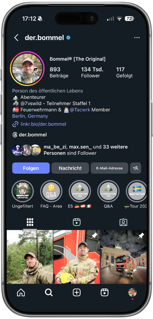 Pascal, bekannt als „Der Bommel“, ist Feuerwehrmann, Abenteurer und Geschichtenerzähler. Er verbindet Blaulicht mit Natur, Kameradschaft mit Freiheit. Ob auf Tour durch den Wald, am Lagerfeuer oder bei Einsätzen – seine Inhalte sind direkt, nah und voller Energie. Seine Videos sind lebendig geschnitten, mit starker Musik, klarer Bildsprache und ehrlichen Emotionen. Pascal zeigt, dass Feuerwehr kein Job, sondern eine Lebenseinstellung ist. Er inspiriert durch Humor, Mut und Bodenständigkeit – ein Typ, der sagt, was er denkt, und tut, was er liebt.