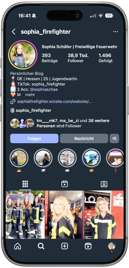 Sophia ist Feuerwehrfrau, Jugendwartin und eine echte Inspiration für die nächste Generation. Auf ihren Kanälen teilt sie, was Feuerwehr ausmacht: Gemeinschaft, Verantwortung und Spaß an der Sache. Sie nimmt ihre Zuschauer mit in Übungen, Ausbildungsmomente und den Alltag der Jugendfeuerwehr – offen, sympathisch und voller Energie. Ihre Reels sind hell, positiv und motivierend – mit klarer Botschaft: Jeder kann Teil dieses Teams sein. Sophia steht für Female Empowerment, Nachwuchsförderung und Herzblut im Ehrenamt. Sie verkörpert das, was Feuerwehr stark macht – Zusammenhalt, Mut und Menschlichkeit.