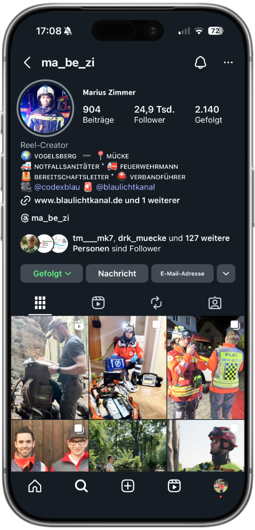 Marius ist Feuerwehrmann, Ausbilder und jemand, der Verantwortung nicht nur lebt, sondern vorlebt. Als *Verbandsführer in einem Sanitätszug des DRK, Bereitschaftsleiter einer DRK-Bereitschaft und aktiver Feuerwehrmann kennt er die komplette Bandbreite aus Rettungsdienst, Feuerwehr und Katastrophenschutz. Diese Kombination macht ihn zu einem echten Allrounder im Bevölkerungsschutz – jemand, der weiß, wovon er spricht. Auf seinem Kanal zeigt Marius praxisnahe Trainings, reale Übungen und Outdoor-Einsätze – ehrlich, strukturiert und mit einer spürbaren Leidenschaft für das Helfen. Seine Inhalte verbinden technische Präzision mit Bodenständigkeit und Begeisterung für Teamarbeit. Wer ihm folgt, spürt sofort: Hier teilt jemand nicht nur Wissen, sondern Erfahrung. Marius steht für Authentizität, Einsatzbereitschaft und fundierte Kenntnisse aus allen Bereichen des Rettungswesens – ein echter Macher mit Herz und Verstand.