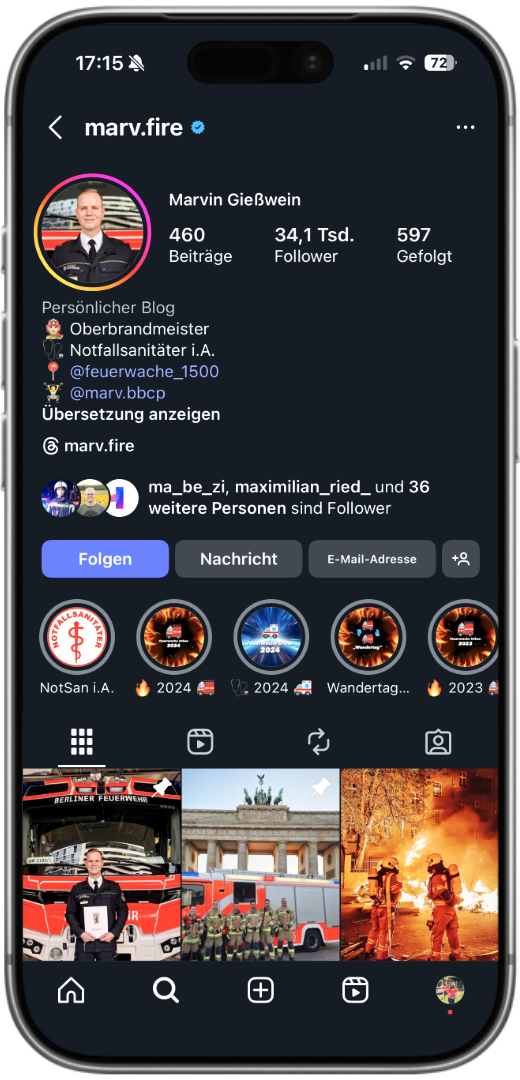 Marvin ist Feuerwehrmann, Ausbilder und Fitness-Enthusiast – und zeigt, dass körperliche und mentale Stärke im Einsatz untrennbar zusammengehören. Auf seinen Kanälen dreht sich alles um Feuerwehralltag, Teamgeist und Training. Mit modernen, energiegeladenen Videos motiviert er andere, an sich zu arbeiten und das Beste aus sich herauszuholen. Seine Inhalte sind dynamisch und echt: Einsatzmomente wechseln sich mit Workout-Clips, Kameradschaftsszenen und ehrlichen Worten über Motivation ab. Marv steht für Leistungsbereitschaft, Disziplin und Zusammenhalt – mit einer ansteckenden Begeisterung, die seine Community mitzieht.